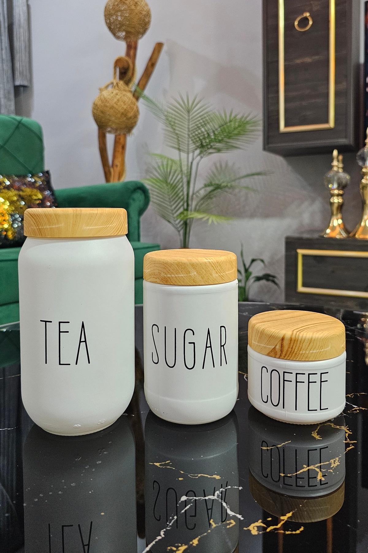 3 lü Bambu Desenli Kapaklı Cam Kavanoz Seti |Coffee Tea Sugar Ahşap Desenli Kapaklı Cam Saklama Kabı