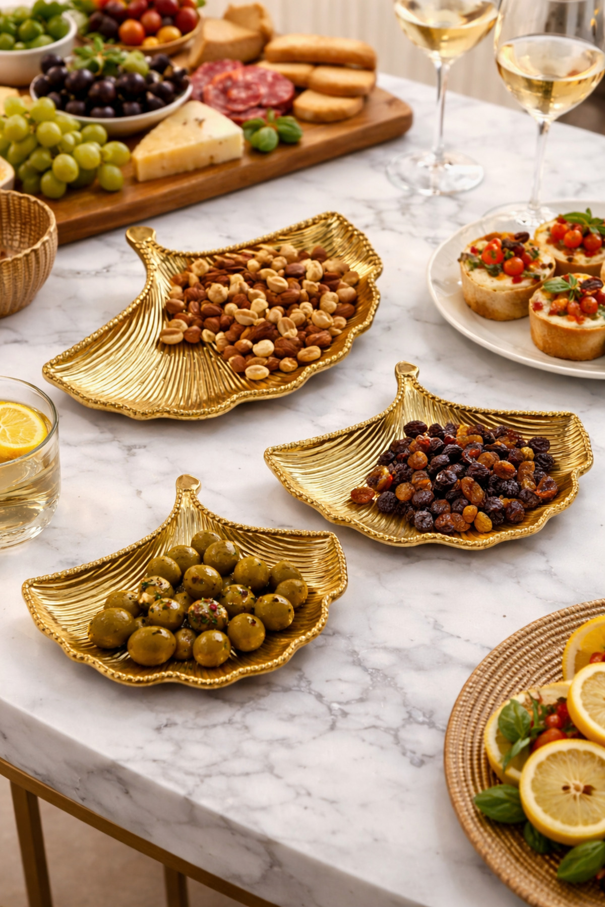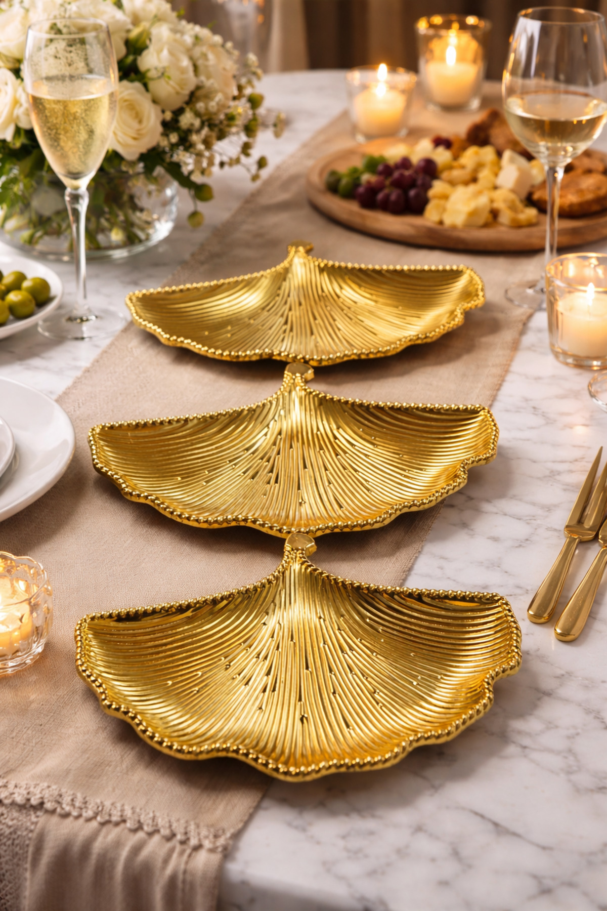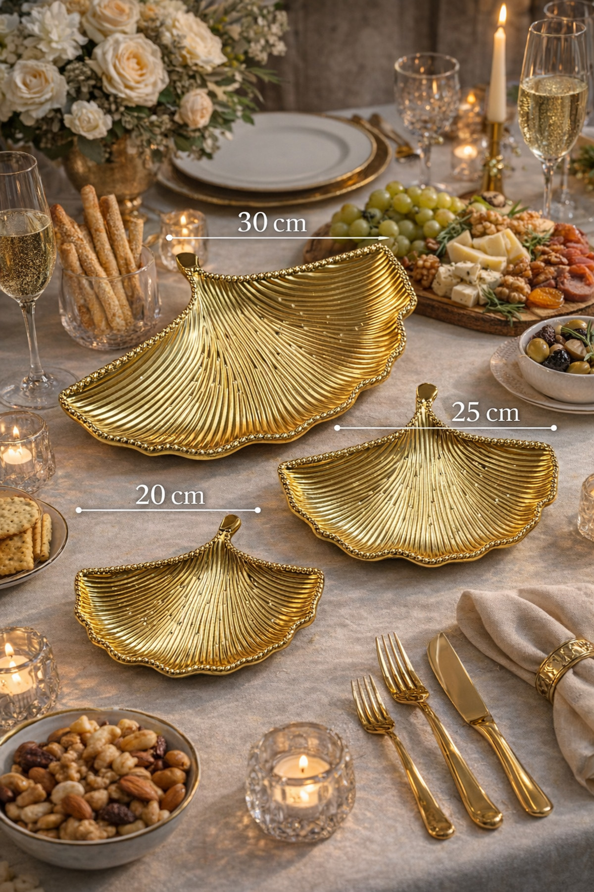 3 farklı boy seçeneğiyle sunulan 3’lü gold metal yaprak sunumluk seti, 20 cm, 25 cm ve 30 cm ölçüleri sayesinde hem günlük kullanımda hem de özel davet sofralarında şık bir sunum deneyimi sağlar.; Çerezlik, lokumluk, drajelik, kahve yanı ikramlık ve dekoratif servis tabağı olarak kullanılabilen bu özel set, zarif yaprak formu ve göz alıcı gold metal görünümüyle sofralara modern ve lüks bir hava katar.; Farklı boyutları sayesinde sunumlarınızı düzenli, estetik ve dikkat çekici hale getirir.; Misafir ağırlarken, kahve sunumlarında, özel günlerde ve dekoratif masa düzenlerinde hem kullanışlı hem gösterişli bir tercih sunar.