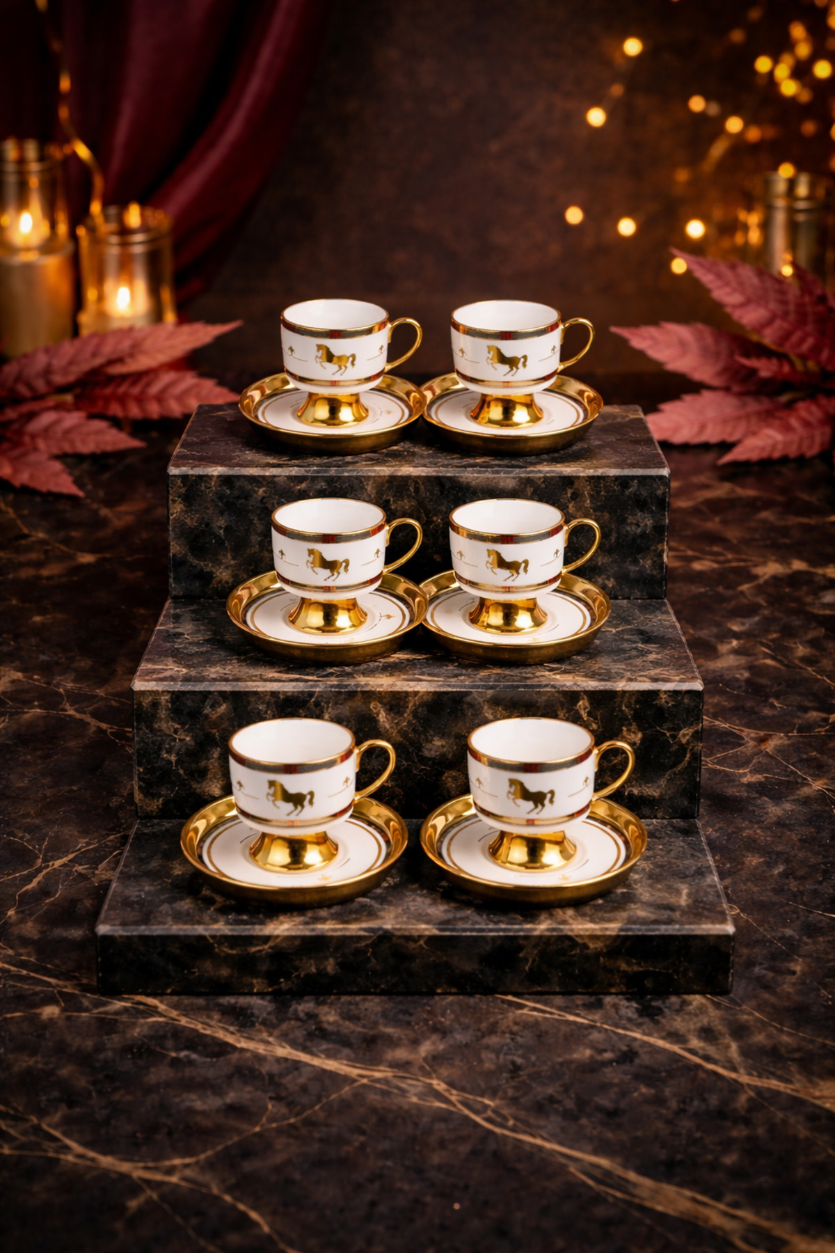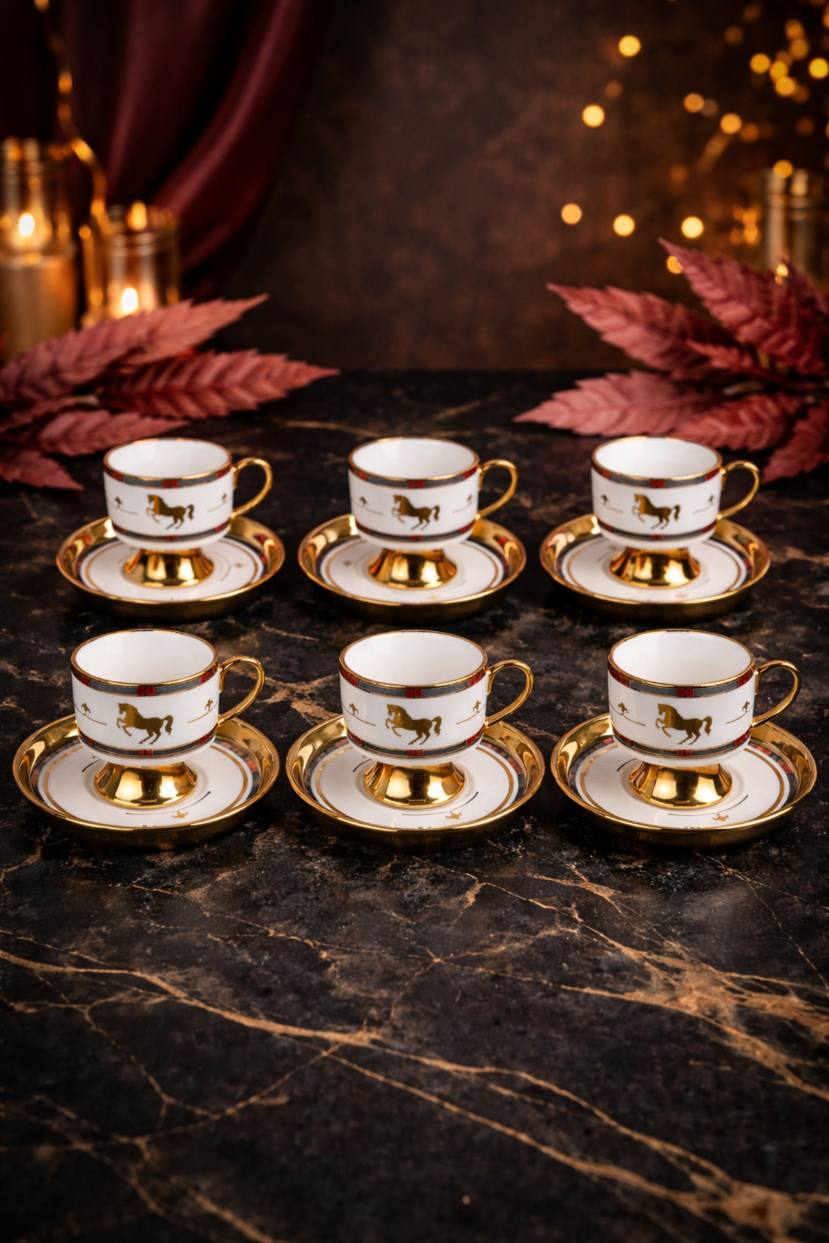 Zarif at motifleri ve göz alıcı gold detaylarıyla tasarlanan 6’lı At Desenli Türk Kahvesi Fincan Takımı, kahve sunumlarınıza lüks ve asil bir dokunuş katar.; Parlak altın renk ayaklı fincanları, şık tabakları ve kaliteli porselen yapısı sayesinde hem günlük kullanım hem de misafir ağırlamalar için idealdir.; Modern ve klasik dekorlarla uyum sağlayan özel tasarımıyla sofralarınızın en dikkat çekici parçası olur.; Çeyiz hazırlığı, yeni ev hediyesi, özel günler ve sevdiklerinize şık bir armağan için mükemmel bir seçimdir.; Dayanıklı yapısı ve estetik görünümü sayesinde uzun yıllar keyifle kullanılabilir.; ✔ 6 kişilik tam set ✔ Özel at desenli şık tasarım ✔ Gold ayaklı lüks görünüm ✔ Kaliteli porselen fincan ve tabaklar ✔ Kahve yanı sunumlar için ideal ✔ Çeyizlik ve hediye için uygun