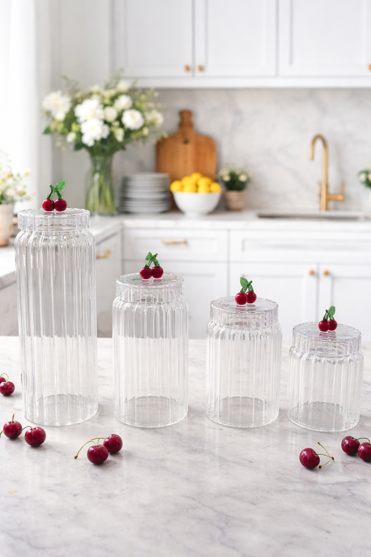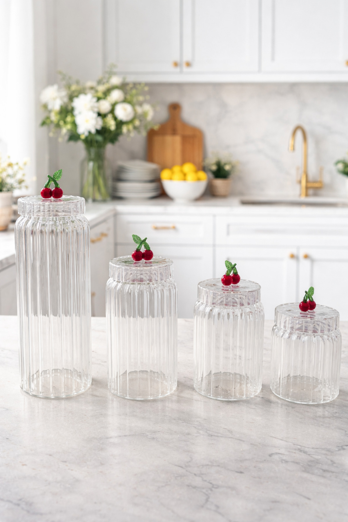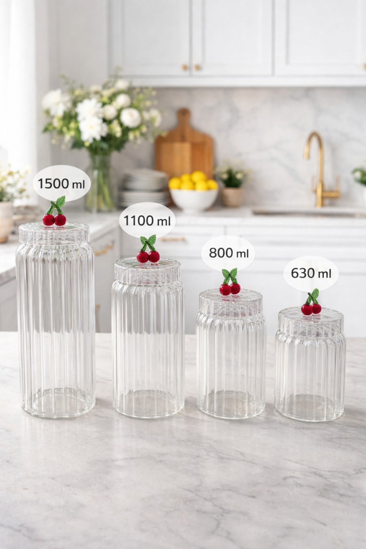 Mutfağınıza hem düzen hem estetik katacak kirazlı cam kavanoz seti ile tanışın! Kapak üzerindeki şık kiraz detayı sayesinde klasik kavanozlardan ayrılan bu özel tasarım, mutfağınıza dekoratif bir hava katar.; ✔ 4 farklı boy avantajı: 1500 ml, 1100 ml, 800 ml, 630 ml ✔ Kirazlı özel tasarım kapak: Şık ve dikkat çekici görünüm ✔ Çok amaçlı kullanım: Bakliyat, kuruyemiş, kahve, şeker, atıştırmalık ✔ Sağlıklı cam malzeme: Koku yapmaz, hijyeniktir ✔ Dekoratif & düzenleyici: Tezgah ve dolaplarda estetik görünüm sağlar Kirazlı kavanoz seti, hem saklama hem sunum için mükemmel bir tercihtir.; Modern mutfakların vazgeçilmez düzenleyicisi olacak! 📌 ÜRÜN ÖZELLİKLERİ Ürün tipi: Kirazlı cam kavanoz seti Adet: 4’lü set Kapasiteler: 1500 ml 1100 ml 800 ml 630 ml Malzeme: Cam Kapak: Kiraz figürlü dekoratif kapak Kullanım alanı: Mutfak, kiler, tezgah düzenleme